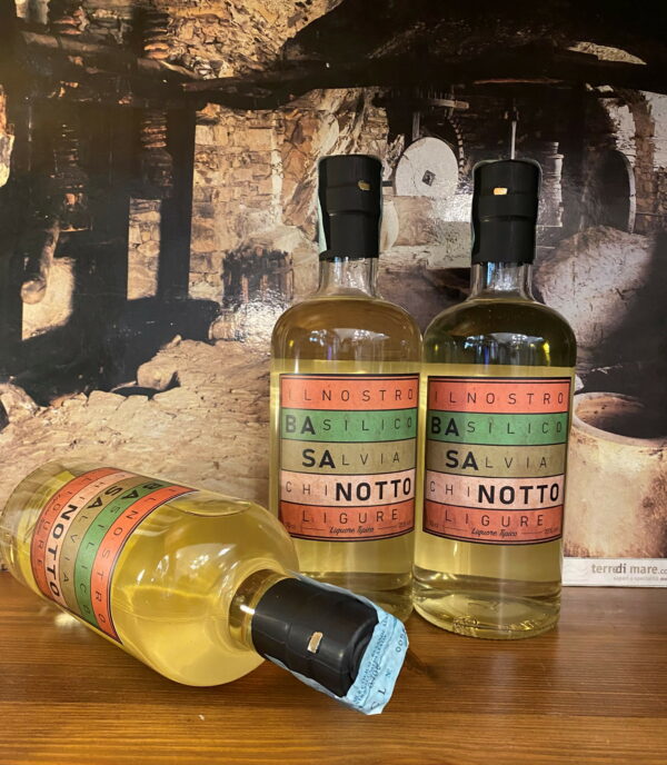 Miscela tre aromi, il Basilico DOP, la Salvia e il Chinotto di Savona – Presidio Slow Food, ottenendo un liquore digestivo e piacevole che si presta per cocktail e bevande estive.